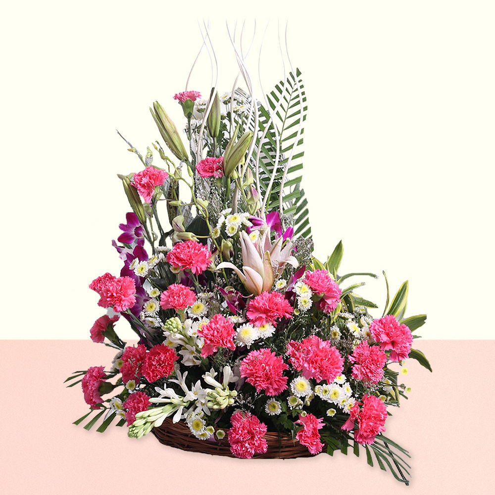 - Flower Type: 22 Pink Carnations+2 Purple Orchids+2 Pink Stems Lilies